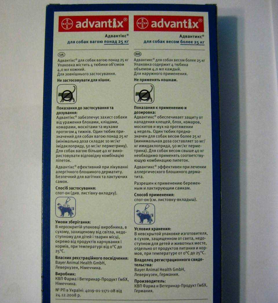 После использования Адвантикса для лечения собаки активные вещества препарата почти не всасываются черед кровь. Они быстро распространяются по поверхности тела и сохраняются на шерсти и кожных покровах.