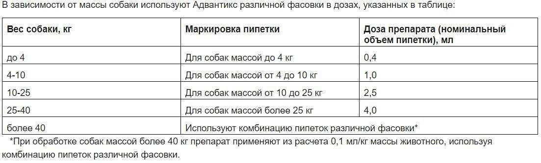 При выборе объема капель нужно учитывать особенности породы и вес питомца. В таблице указана рекомендуемая дозировка препарата.