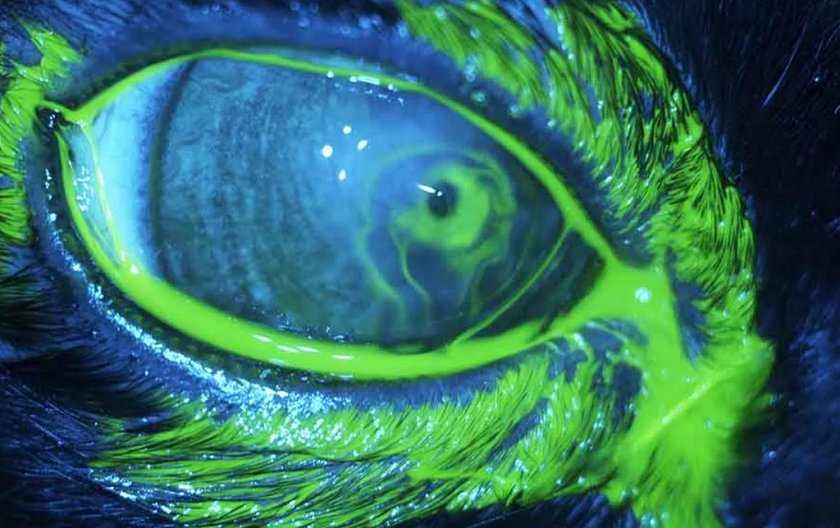 Иногда трудно поставить точный диагноз. Ветеринарный врач капает на поверхность глаза животного специальную жидкость и при подсвечивании, в месте язвочек она светится зеленым светом.
