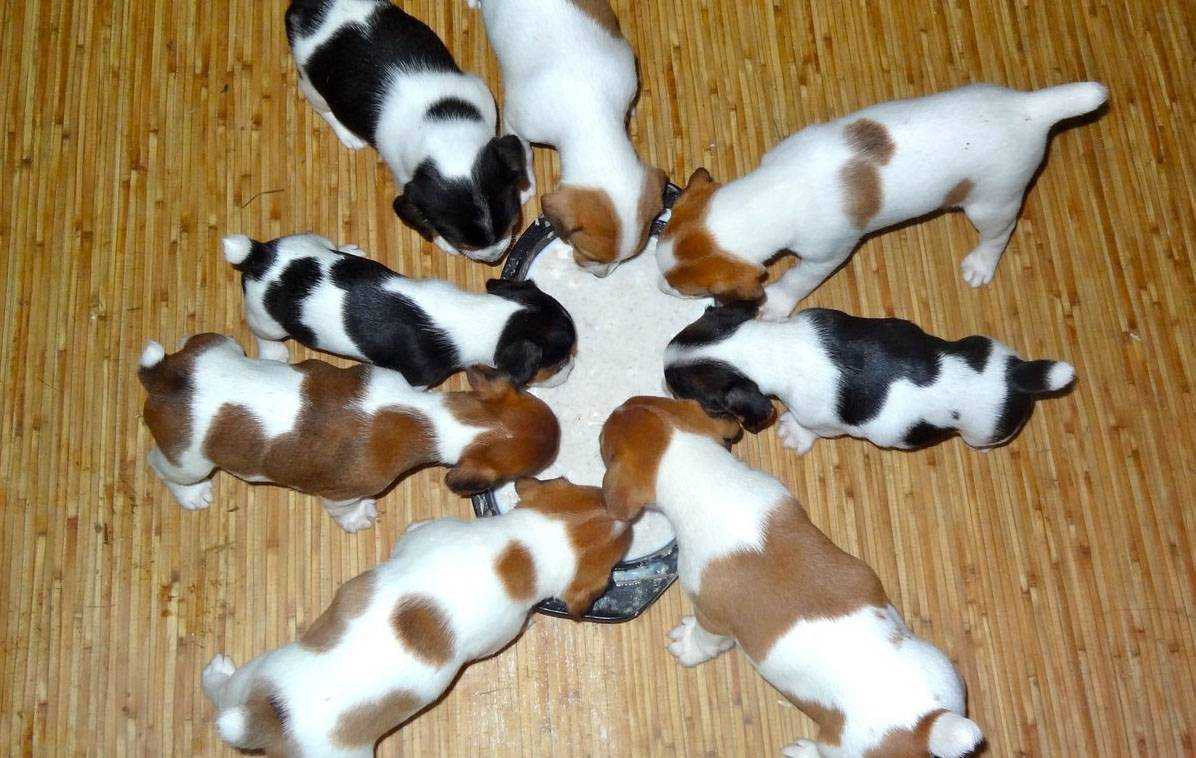 В первый месяц жизни щенков нужно докармливать сухим кормом до 4-х раз в сутки из 6-8 кормлений. В остальное время их должна кормить мать. Вес щенка джек рассела в 1 месяц – 0,8-1,4 кг
