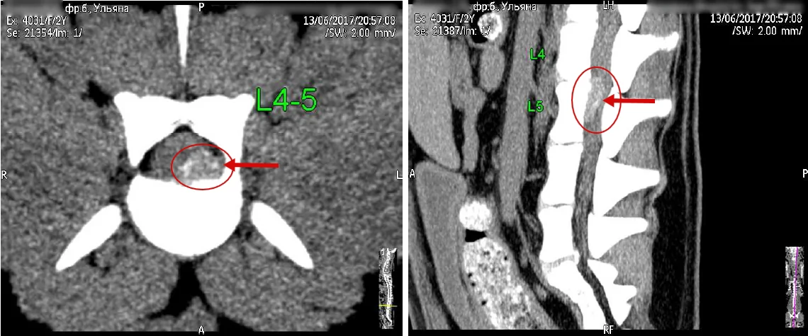 Данный случай хорошо иллюстрирует неэффективность КТ для диагностики повреждений спинного мозга в тех случаях, когда нет значимого сужения спинномозгового канала.