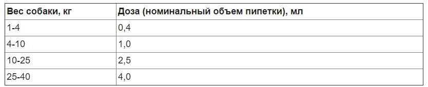 Если вес животного превышает 40 кг, берут упаковку на 6 мл. При массе пса больше 60 кг, комбинируют две пипетки разных фасовок, чей суммарный объем максимально приближен к размерам питомца.