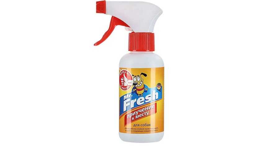 Спрей Mr. Fresh «Приучение к месту» (200 мл). Как и предыдущее, средство подходит для приучения к пеленкам и лотку, т.е. для маленьких пород и щенков. Спрей нужно брызгать в то место, куда собака должна ходить в туалет. Стоимость — примерно 300 рублей.