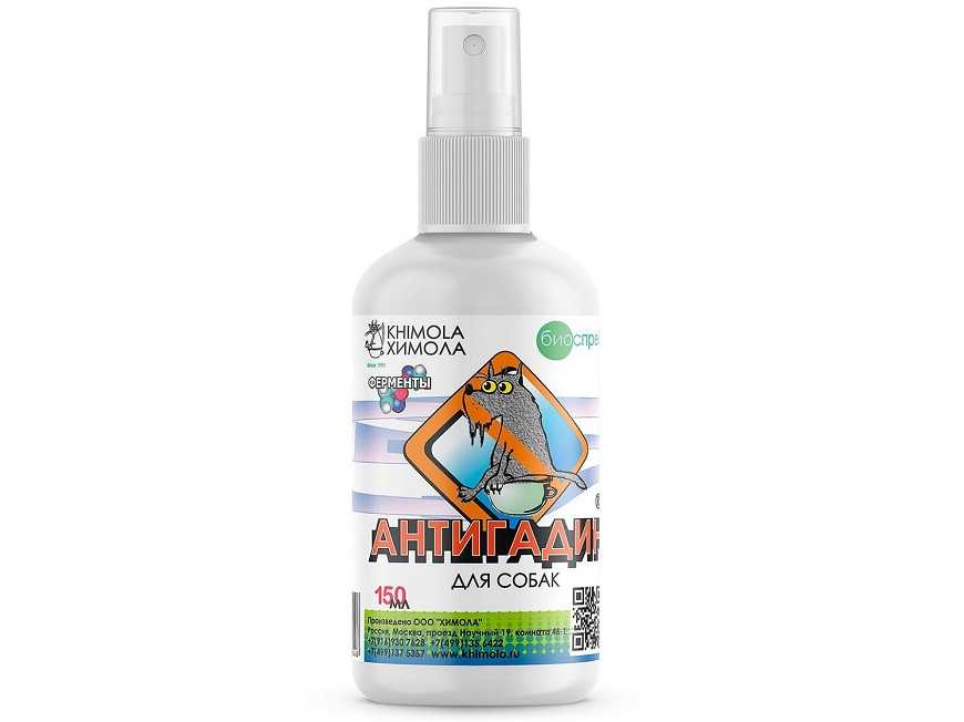 Антигадин (150 мл). Средство, имеющее в своем составе определенное количество эфирных масел (какие именно масла входят, производитель скрывает), которые отпугивают животных. Собака перестает гадить в то место, где это всегда делала. Средство можно наносить на любую поверхность (голые полы, ковры и пр.). Выполнять процедуру придется несколько раз, от одного раза эффекта не будет. Стоимость — примерно 200 рублей.