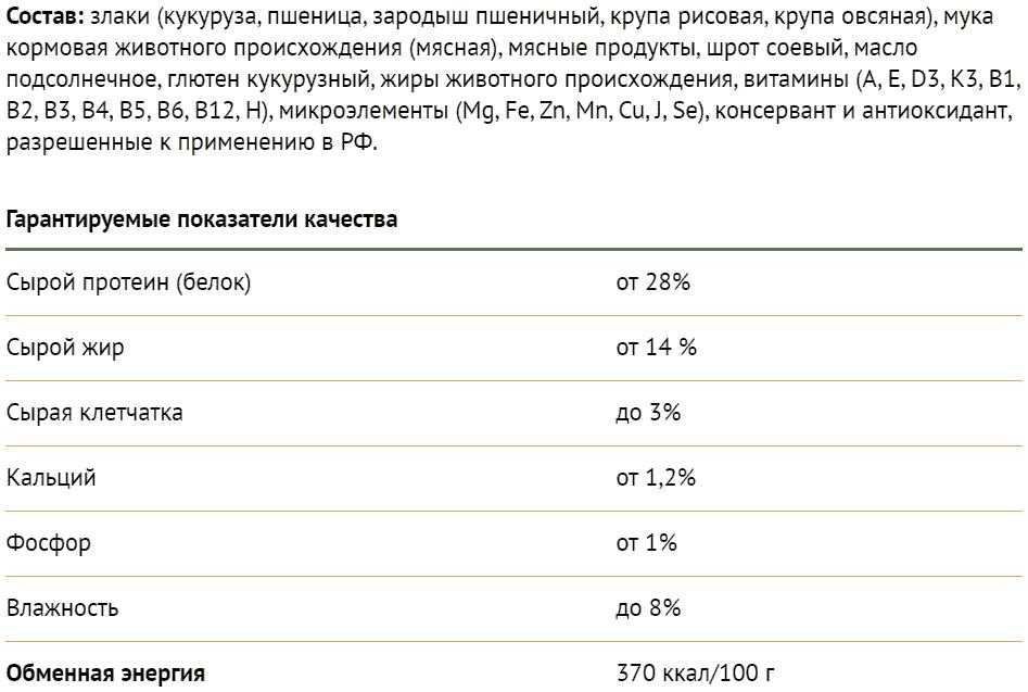 Процентное содержание белка и жира не отличается от предыдущего корма, как и его энергетическая ценность.