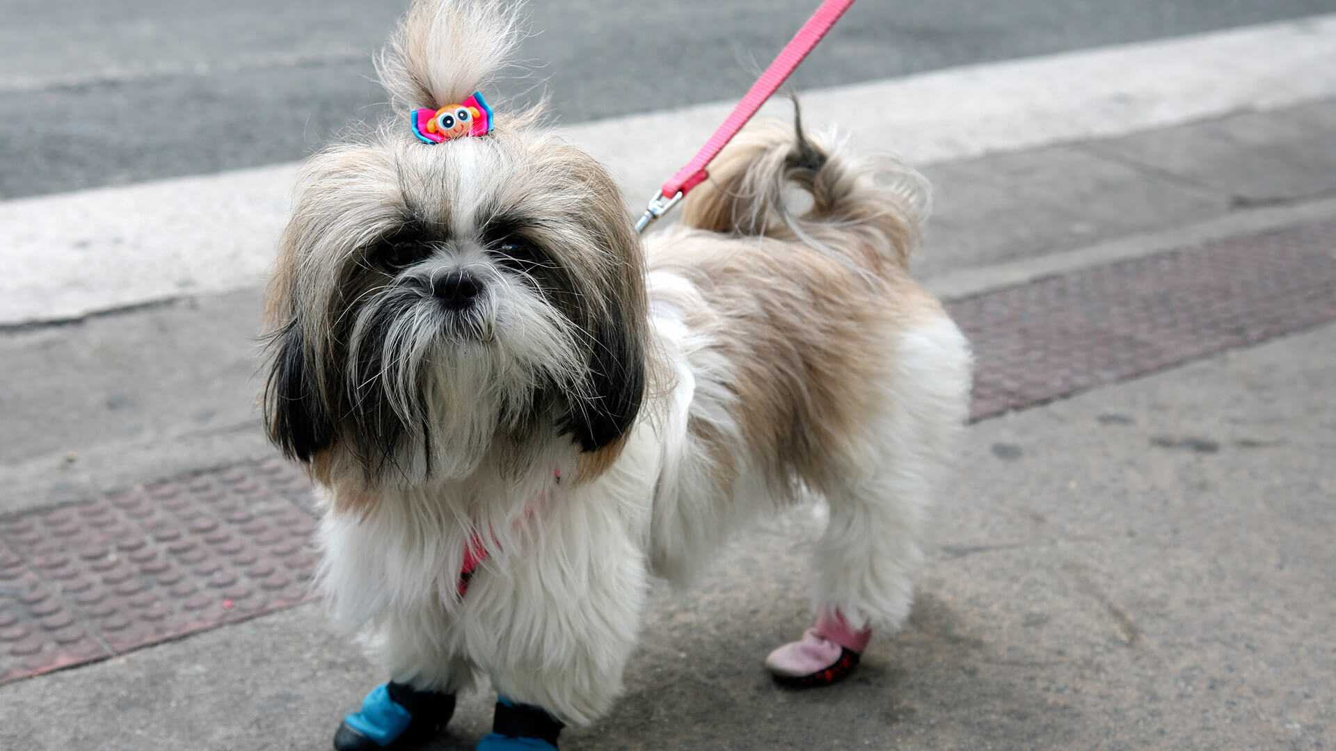 Дело в том, что во время прогулок его длинная шерстка сильно пачкается, и пёсель выглядит как безродная замарашка. Не рекомендуем выгуливать питомца в слякоть, тем более что серьезные физические нагрузки ему не нужны. Если вы приверженец здорового образа жизни, в том числе и для вашего питомца, купите ему защитную одежду. К тому же кроха, наряженная в модный комбинезончик или яркий плащик, выглядит чрезвычайно умилительно. А вот в поводке нет острой необходимости. Ши-тцу не убегают далеко от хозяина, только у дороги берите своего любимца на руки.