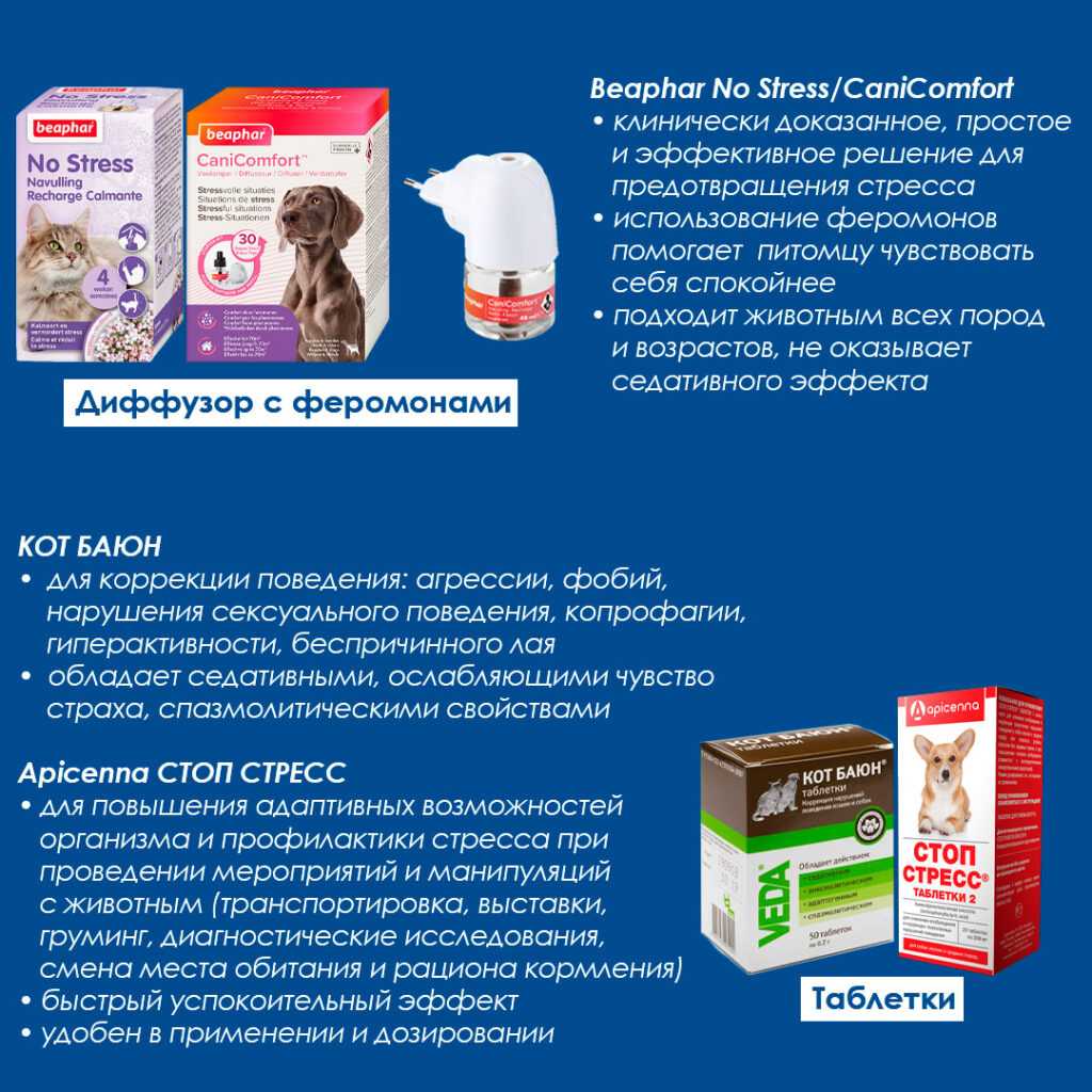 - успокоительное средство для собак/котов в дорогу (успокаивают животное, притупляют чувство страха, купируют симптомы укачивания);