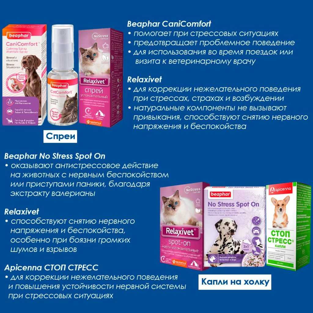 «Стоп-стресс». Это комплексное, успокоительное средство, главным действующим веществом является фенибут. Здесь есть и лекарственные травы, что в комплексе дают такой эффект. Но у этого препарата есть множество побочных эффектов, в частности заторможенность и сонливость. Препарат запрещено использовать в профилактических целях. Следует учитывать все ограничения, то есть не давать это лекарство животным в возрасте до одного года, кормящим и беременным животным. То есть без консультации с врачом не обойтись.