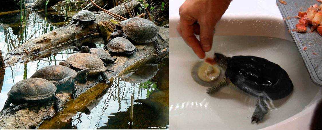 Несмотря на то что рептилии непривередливы к еде, кормить болотных черепах в домашних условиях нужно правильно, учитывая возраст. Маленьких черепашек, которые активно развиваются, кормят раз в сутки, но в террариуме должны постоянно присутствовать водоросли, пригодные для еды. Порция пищи состоит из двух или трех кусочков рыбы размером 1 см3.