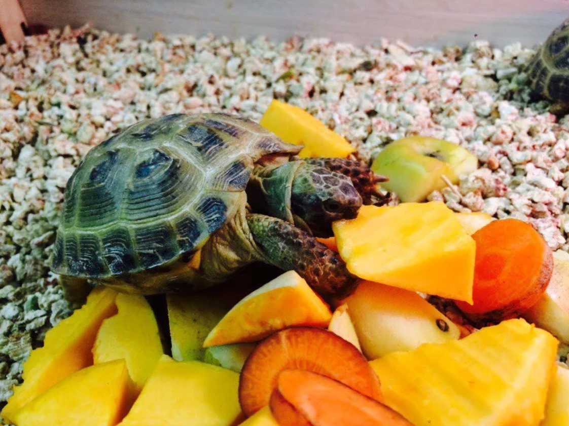 Растения. Подойдут листья одуванчика, клевера, подорожника или люцерна, листовой салат, капуста, сухая морская капуста, мята, бананы, яблоки груши, морковь, тыква, кабачки, огурцы. Давать не более 2 раз в неделю.