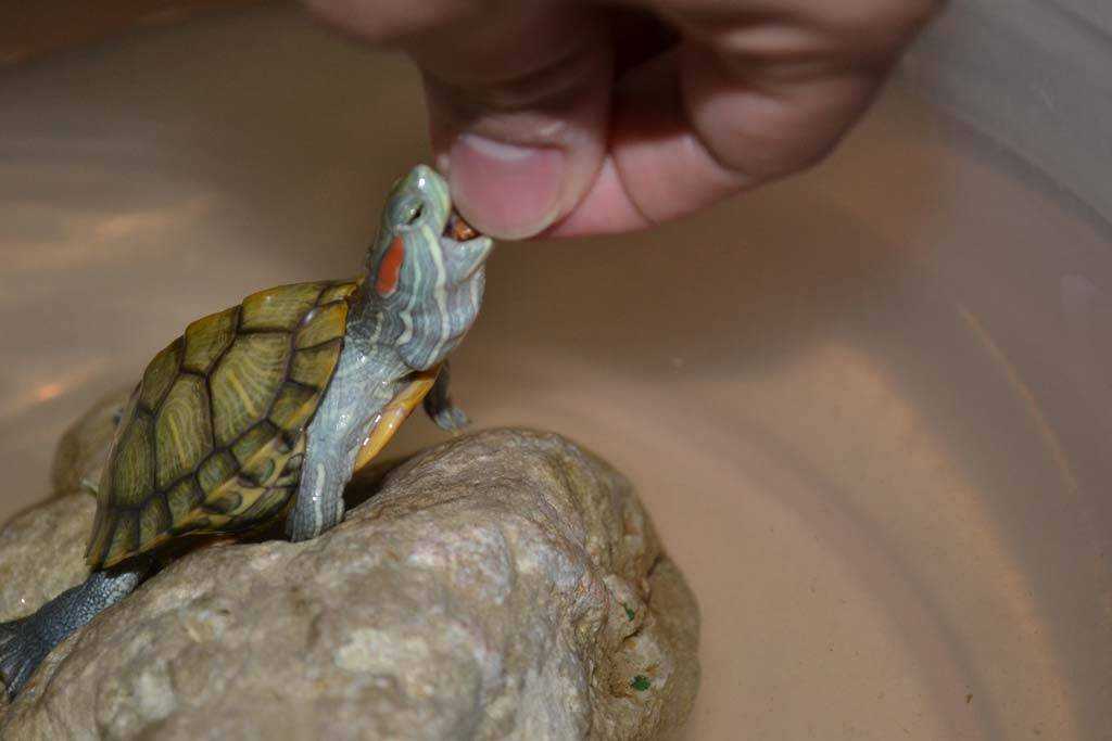Чем можно кормить красноухую водную черепаху с рук? Для приручения подойдут любые кусочки твердой пищи, кроме готовых сухих кормов. Гранула должна намокнуть, чтобы черепаха не поранила ротовую полость. Скользкий маленький комочек пищи животное не сможет взять из рук, не укусив хозяина за палец. Красноухие черепахи активны, сильны и стремительны. Следует помнить это, угощая рептилию лакомством.