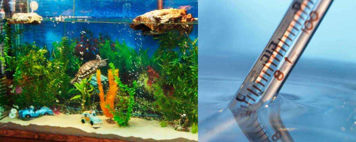 При помощи погружного термометра контролируйте температуру водной среды. Оптимальное значение для черепашки находится в пределах от 22 до 24 градусов. При необходимости включайте подогрев воды.