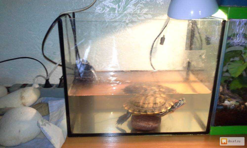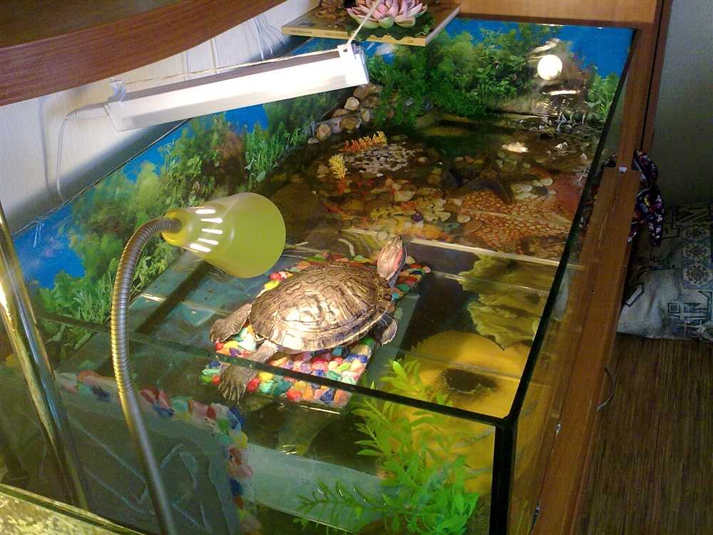 Уровень воды в бассейне должен позволять красноухой черепахе свободно плавать и переворачиваться (глубина больше ширины панциря). Чем больше объем воды, тем реже его придется менять.