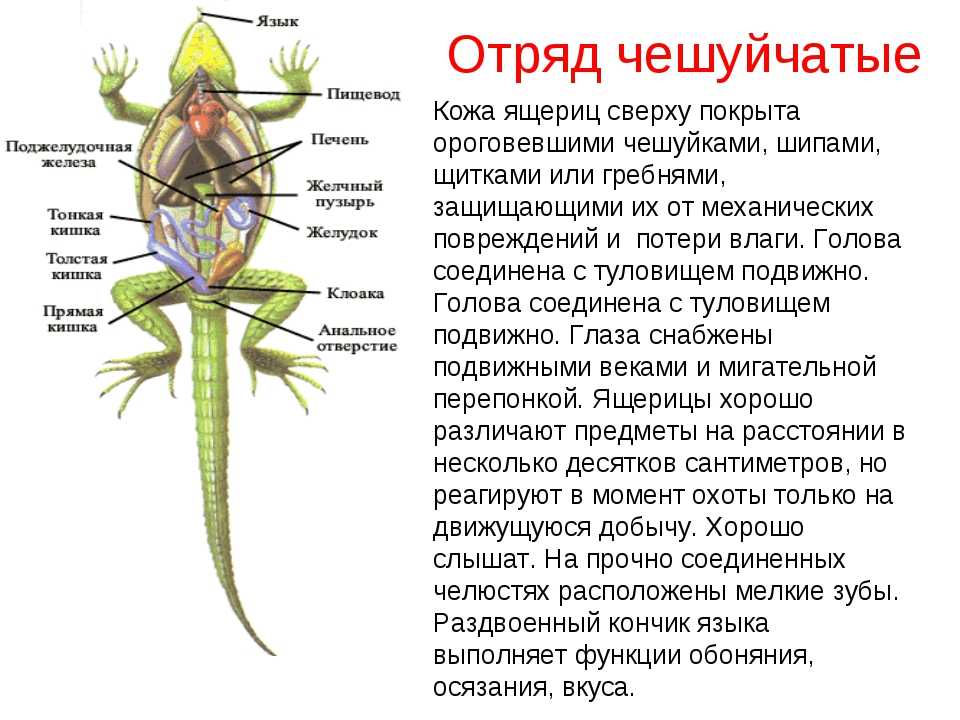 Пищеварительная система рептилий по своему строению аналогична земноводным. Об органах пищеварения можно узнать по рисунку.